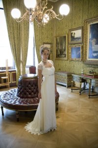 Next up was the possibility of an empire line dress which would harmonise beautifully with the neo classical architecture of Compton Verney, the venue for our wedding breakfast. For a while, I did get quite carried away with the notion of a regency style wedding: there are plenty of dresses around that would fit the bill and I could just picture me and MoH looking like dead ringers for the Bennett sisters. My enthusiasm waned a little, however, when it occurred to me that if I over indulged during the wedding breakfast a very high-waisted gown might not be the most flattering style for a bride with a tummy full of sausage and mash.