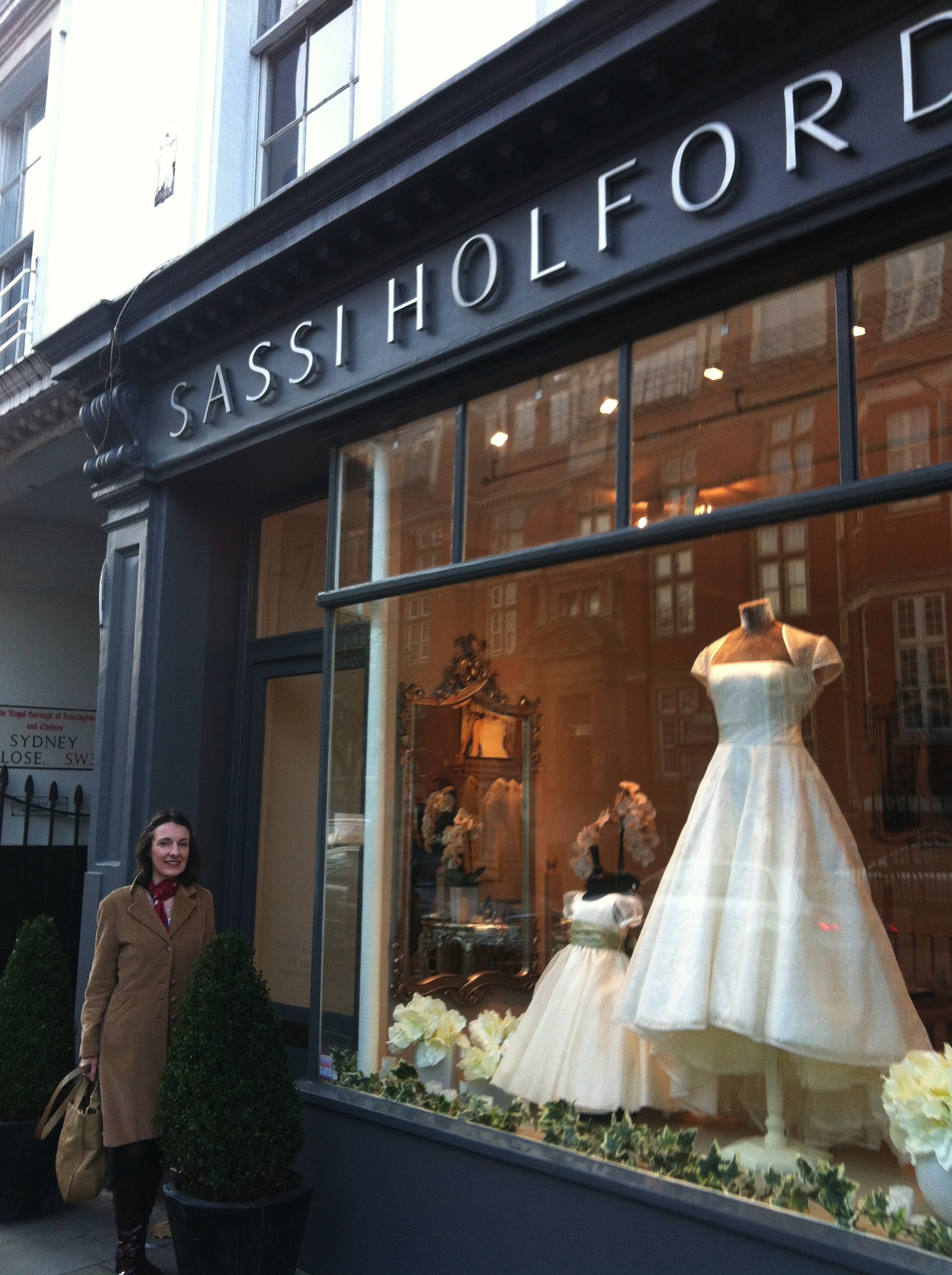 Now where were we?  Oh, yes, outside Sassi Holford’s shop in South Kensington. If you are a recent bride or a bride-to-be you are probably well aware of Sassi Holford but  if not, her name may not be so familar. So let me introduce you: Sassi Holford is a wedding dress designer of international catwalk acclaim whose simply stunning creations have been described as being more society than celebrity.  Indeed, in 2008 Sassi Holford was commissioned to design and make the gown which Autumn Kelly wore at her marriage to Peter Phillips, the Queen’s grandson.