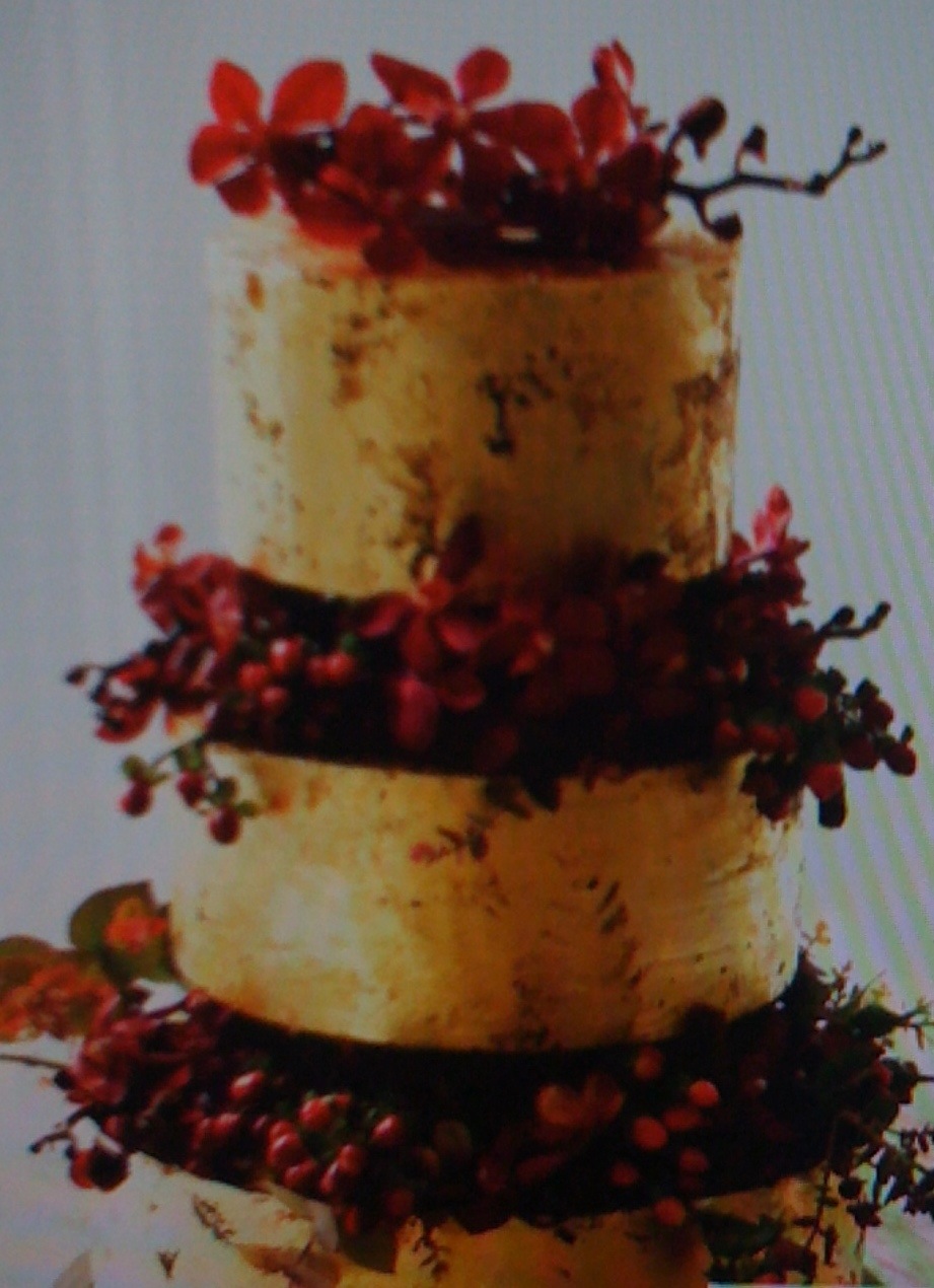 Take, for example, the wedding cake. Initially, I was all for a three-tier fruit cake complete with traditional style topper, but that changed the day I stumbled across a photograph of a chocolate cake enrobed in real gold leaf and decorated with entwined crimson flowers and berries. Even from the rather poor photograph below I think you can see that this cake scores high when it comes to having the wow factor.