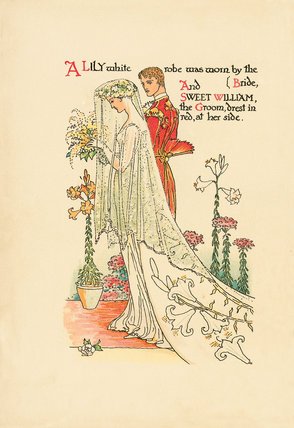 Walter Crane, a leading light in the arts and crafts movement, is particularly well-remembered for his charming, and hugely influential, contribution to children’s book illustration. In A Flower Wedding, he employs this style to illustrate a delightful poem about two wall flowers describing the wedding of their floral neighbours.